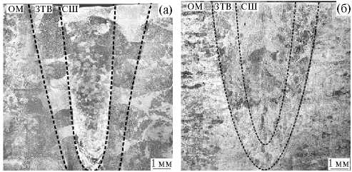 Рис. 1. Оптические изображения структуры имитированных сварных швов в поперечных сечениях образцов, полученных с использованием ЭЛАТ (а) и технологии СЛС (б).