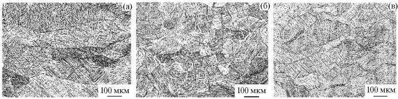 На рис. 2а–в представлены оптические изображения микроструктуры зон СШ, ЗТВ и зоны ОМ в ЭЛАТ образце. В зоне СШ первичные β-зерна имеют изотропную форму и размер ≈ 0.2 мм, в зонах ЗТВ и ОМ — анизотропную форму и поперечный размер зерна ≈ 0.9 мм. Светлая полоса на рис. 2а между зонами СШ и ЗТВ представляет собой зону сплавления.