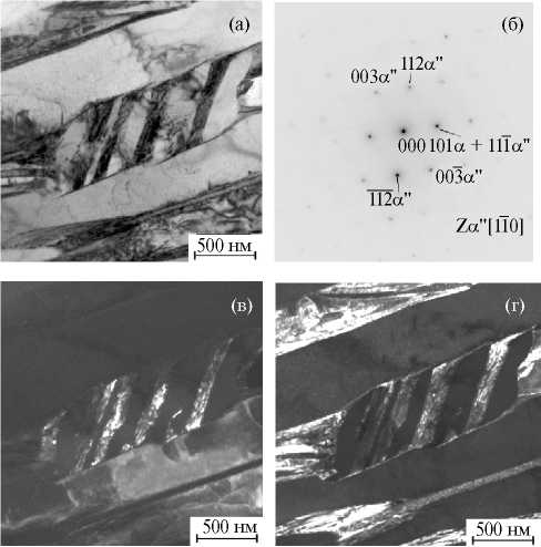 Рис. 5. Электронно-микроскопические изображения микроструктуры СЛС-образца в зоне СШ: а — светлое поле, б — микродифракция, в — темное поле в рефлексе 003 оси зоны [10] α″, г — темное поле в совпадающих рефлексах 11 оси зоны [10] α″ и 101 α.