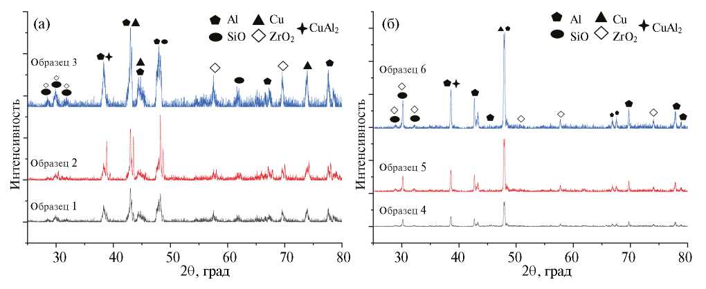 На рис. 2 показаны рентгеновские дифрактограммы изготовленных образцов. Образцы были классифицированы в зависимости от температуры спекания. Видно, что ширина пиков уменьшается, а их интенсивность увеличивается с ростом температуры спекания. Для всех образцов были выявлены чистые элементы Al, Cu, упрочняющие оксиды и карбиды, а также сформированная интерметаллидная фаза, содержащая Al и Cu. Как и ожидалось, наиболее интенсивные пики принадлежат Al и Cu, по причине их наибольшего содержания в химическом составе. Также было определено наличие SiC и ZrO2. Кроме того, наблюдается образование соединения CuAl2. Интерметаллические соединения обеспечивают улучшение трибологических и механических характеристик. Видно, что интенсивность пиков повышается с увеличением содержания Cu при обеих температурах спекания. Выполненная оценка дифрактограмм согласуется с результатами предыдущего исследования [22–24]. Параметры решетки и кристаллографические плоскости для пиков с максимальной интенсивностью приведены в табл. 2.
