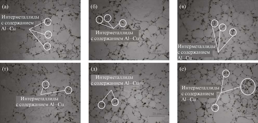 Рис. 4. Предельные оптические изображения интерметаллидов, присутствующих в изготовленных образцах: (a) образец 1; (б) образец 2; (в) образец 3; (г) образец 4; (д) образец 5; (е) образец 6.