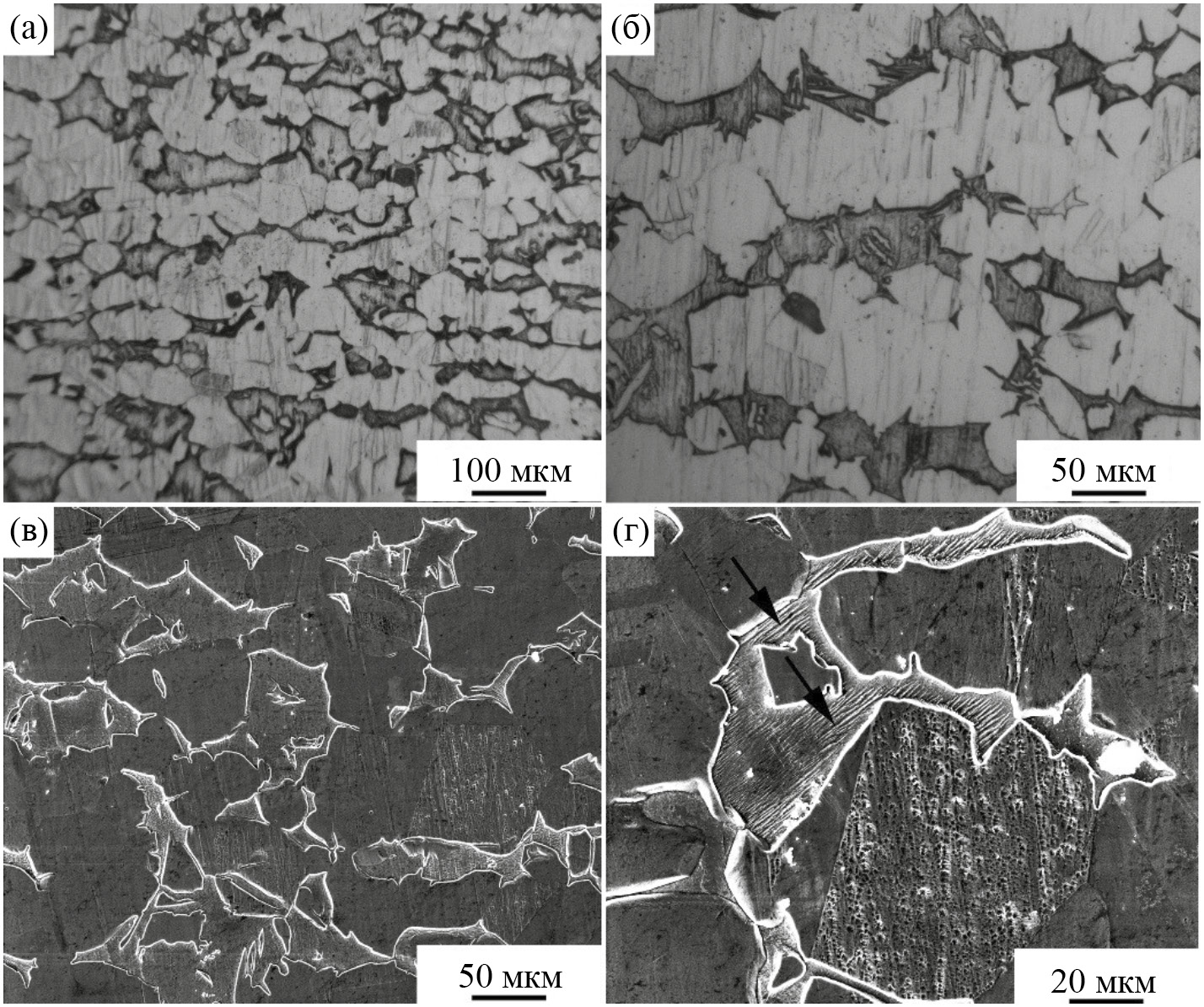 Рис. 2. ОМ- (а, б) и РЭМ- (в, г) изображения микроструктуры сплава Cu–41%Zn после горячей прокатки с обжатием 90% и закалки в воде. На ОМ-изображениях α-зерна более светлые по контрасту. На РЭМ-изображениях α-зерна более темные, а расположенные между ними 3R/9R зерна–светлые. Однонаправленная структура бейнита указана стрелками (г).