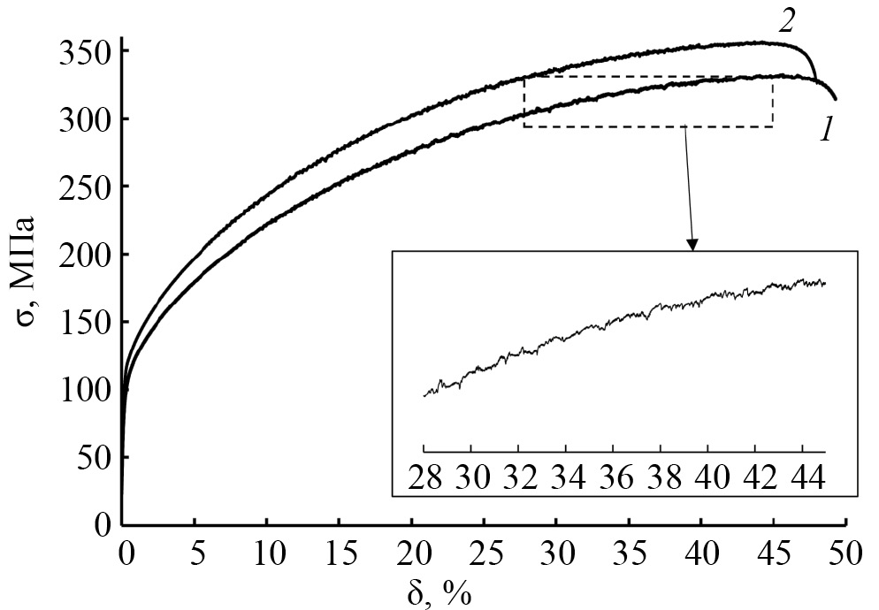 Рис. 3. Кривые деформации σ–δ сплава Cu–41%Zn после горячей прокатки с закалкой (кривая 1) и последующего отжига при 200°С, 2 ч (кривая 2).