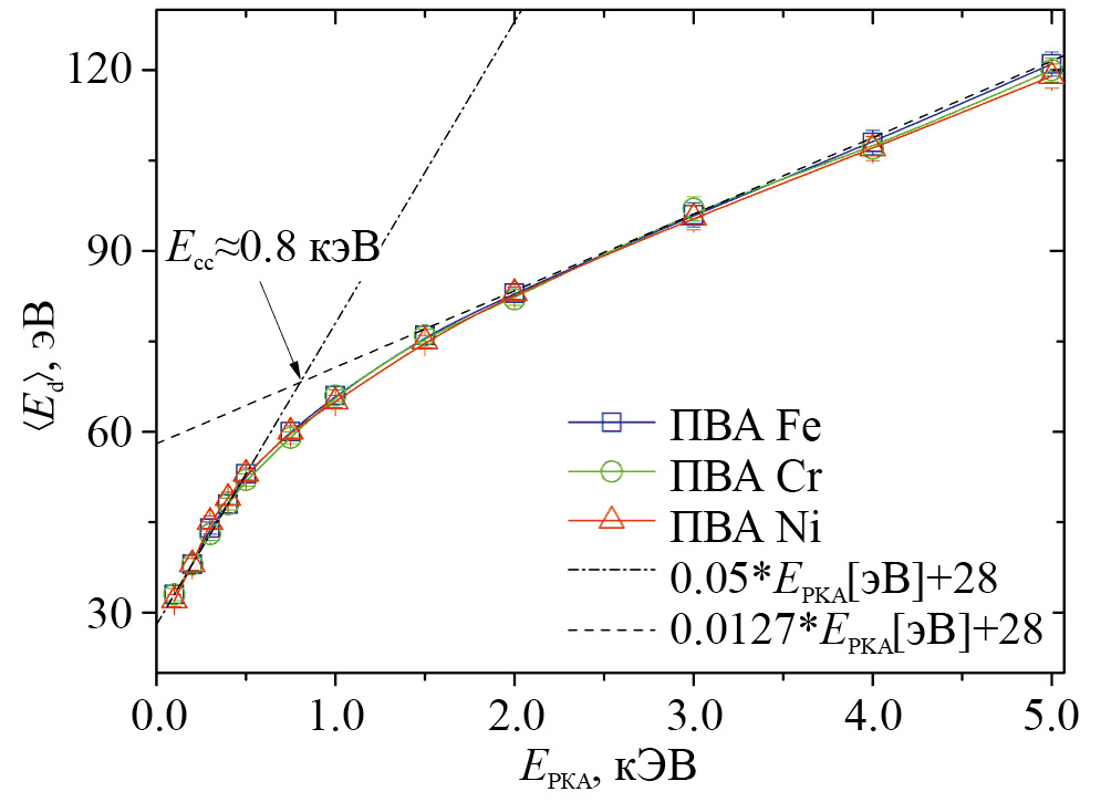 Следует, однако, отметить, что использование параметра ⟨Ed⟩ = 28±1 эВ в качестве пороговой энергии смещения при расчете каскадной функции (1) в представлении Кинчина–Пиза неизбежно приведет к существенной переоценке числа пар Френкеля, образованных в неупорядоченном твердом растворе Fe–Cr–Ni, облучаемом быстрыми частицами в режиме упругих потерь энергии. Отклонение от реальной величины NFP в сторону бо́льших значений будет тем значительнее, чем выше энергия ПВА.