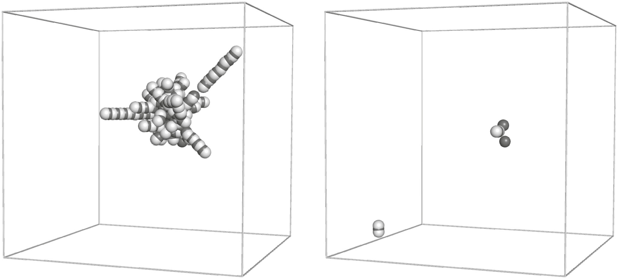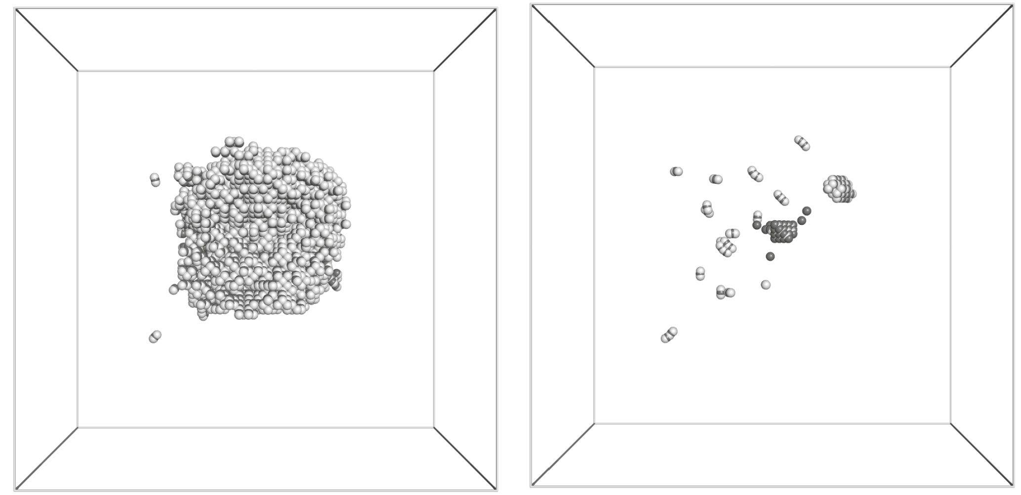 Рис. 3. Каскад столкновений, инициированный атомом Fe с энергией EPKA = 4 кэВ. Слева показан момент, соответствующий максимальному числу смещенных атомов. Справа приведена окончательная конфигурация точечных дефектов и их кластеров после релаксации каскада столкновений. Черным и белым цветом обозначены соответственно вакансии и смещенные атомы.