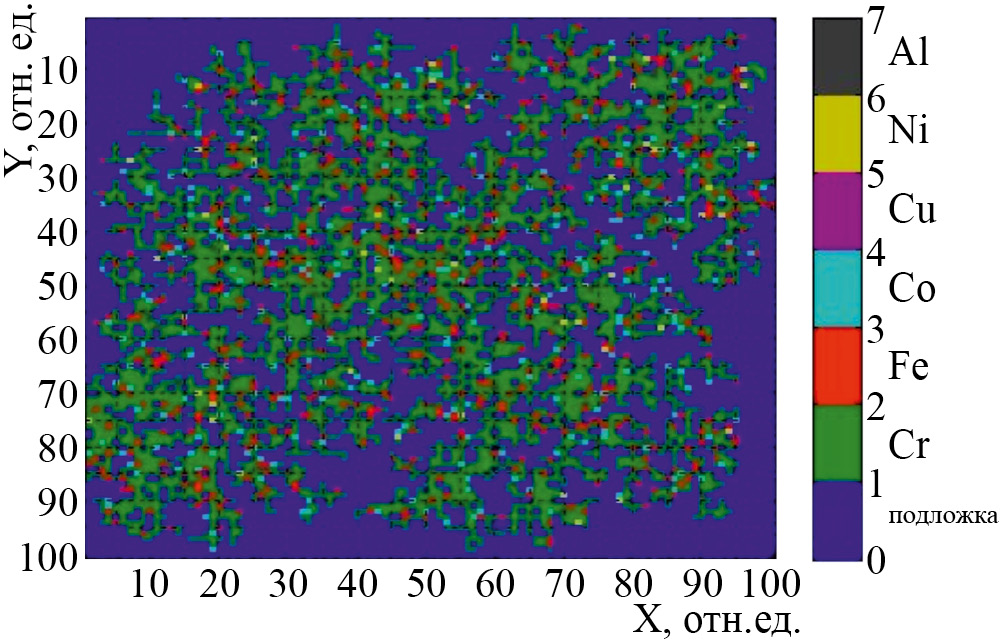 Рис. 4. DLA-модель: цветом выделены разные частицы компонент сплава (цвет определяет состав – см. рис. 5).