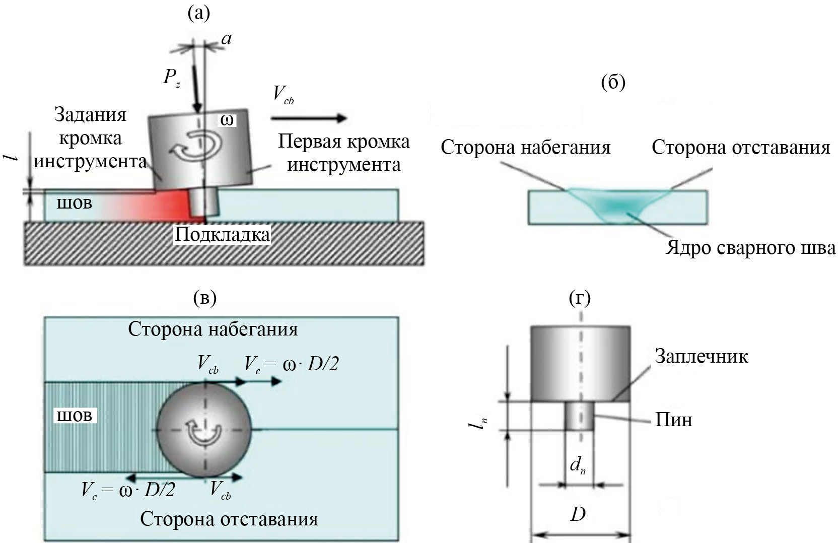 Рис. 1. Схема процесса сварки трением с перемешиванием: а – общий вид; б – разрез шва; в – вид сверху; г – рабочий инструмент.