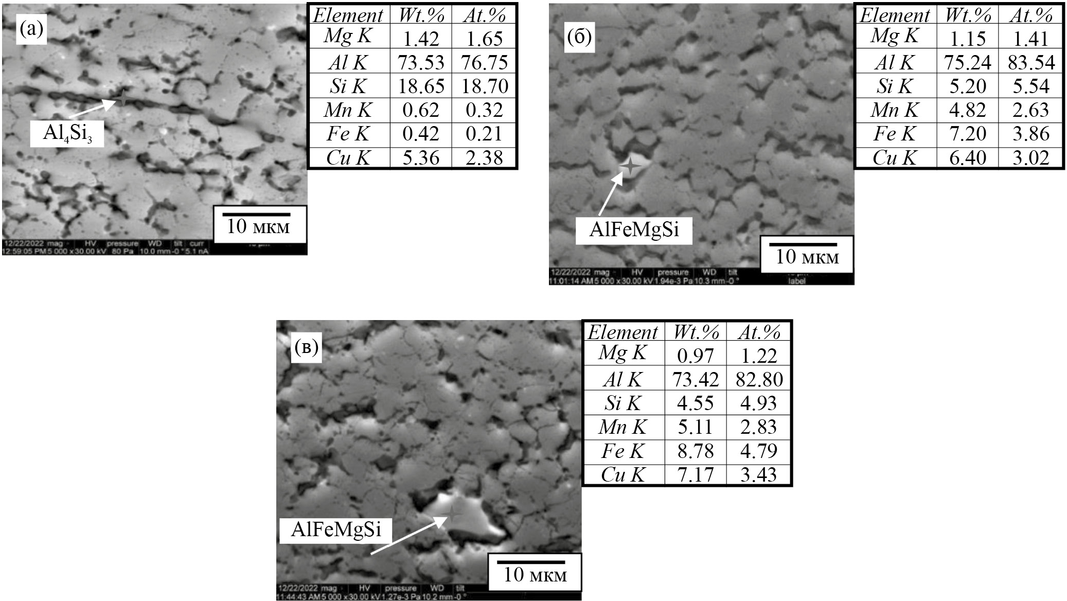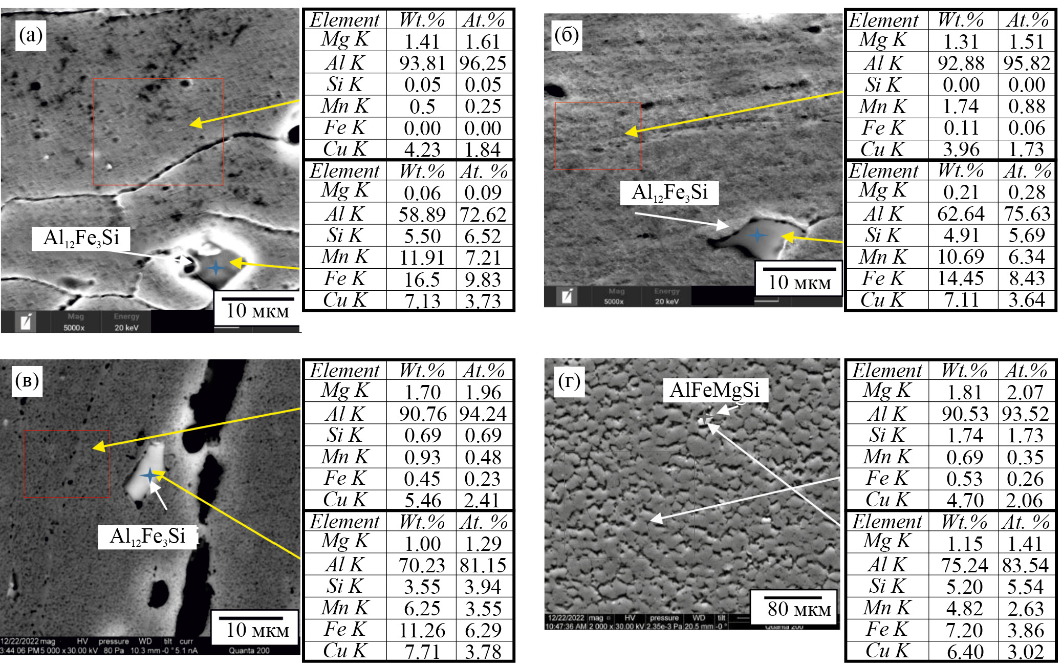 Согласно литературным данным табл. 3 и полученным в нашей работе данным рентгеноструктурного анализа в исходном состоянии в сплаве присутствуют следующие фазы: α-Al, S-фаза (Al2CuMg) и обогащенная железом вторичная Т-фаза (Al12Fe3Si) (рис. 5а).