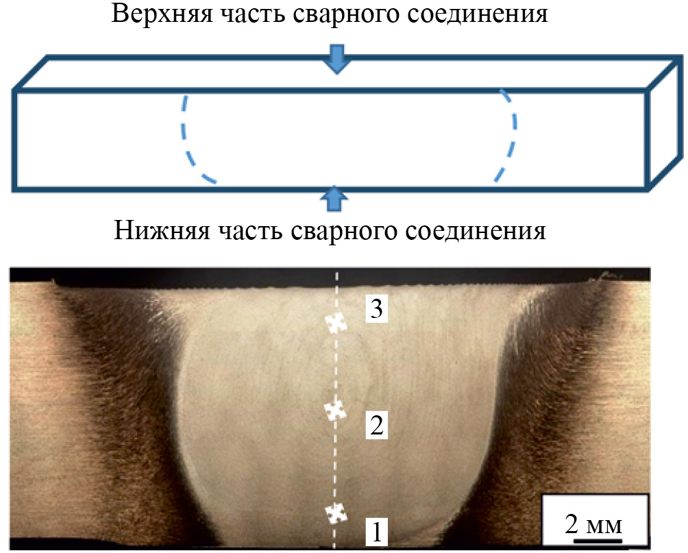 На рис. 7 представлена схема с указанием анализируемых участков зоны ядра сварного шва (2 мм от верхнего и нижнего края соединения и центр).