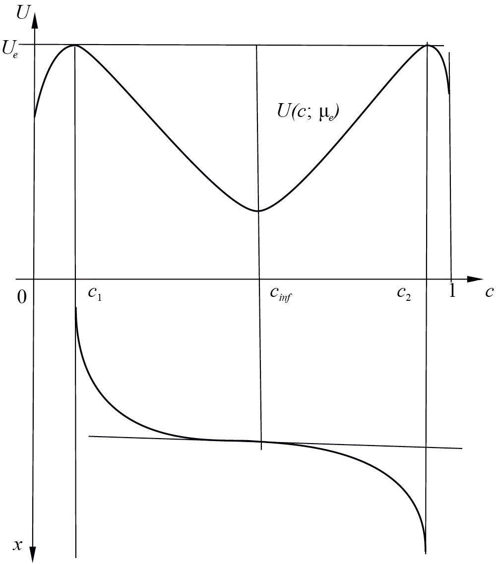 Значения концентраций в точках касания c1,2 – это значения равновесных пределов растворимости, cinf – значение концентрации в точке перегиба профиля c(x), которой соответствует минимум потенциальной функции U(c).