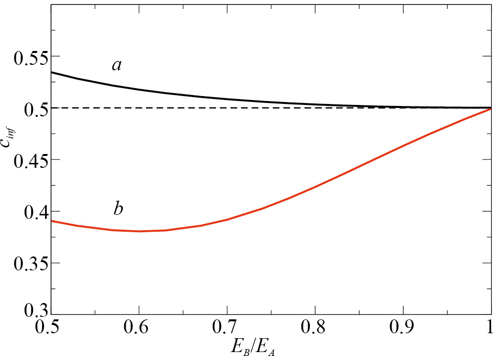 В качестве основы для анализа влияния параметров концентрационной зависимости объемной плотности свободной энергии возьмем сплав Fe–Cu с ГЦК-решеткой. Коэффициенты концентрационной зависимости для этого сплава EA = 54 124 Дж/моль и EB = 42 288 Дж/моль приведены в работе [5].