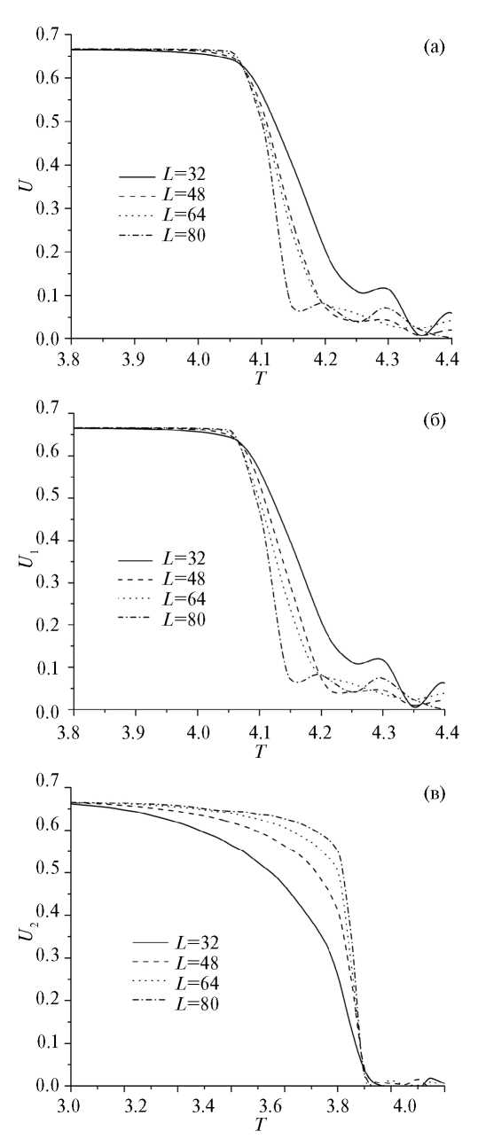 После чего вычисляли кумулянт Биндера U при различных температурах и размерах системы: