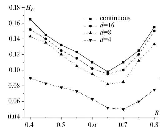 Рис. 8. Зависимость коэрцитивной силы Hc от отношения обменных интегралов R для пленок с толщиной магнитомягкого слоя D2=6 и различным периодом решетки антиточек d.