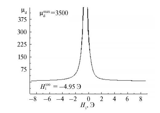 Амплитуду пика дифференциальной проницаемости легко оценить по изменению результирующей индукции в данном диапазоне изменения поля. Например, при изменении поля от нуля до –400 А/м индукция изменяется от 73.8 кА/м до нуля, что дает среднее значение относительной дифференциальной проницаемости 2310. Ввиду близости к ее максимальному экспериментальному значению 2500 (см. рис. 3), очевидно, что оно отражает реальное положение дел.