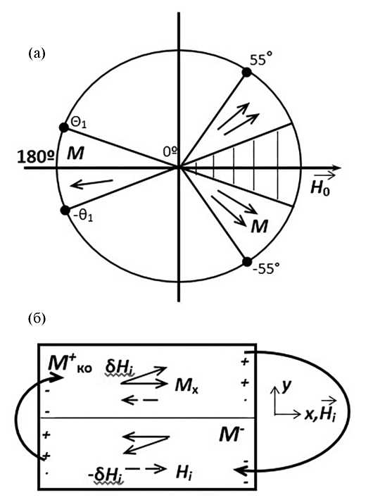 В результате образуется обратная магнитная фаза в виде конуса вокруг оси, обратной направлению магнитного поля Н0х с θ = 180° [4], где намагниченность < 0 занимает конус с углами (180°±θ1). Этот необратимый процесс имеет место еще до появления 180-градусных ДГ, которые могут появиться при Нi = 0 [4] и в рассматриваемом диапазоне полей 4.32 кА/м ≥ Нi ≥ 100 А/м является единственным механизмом изменения величины намагниченности.