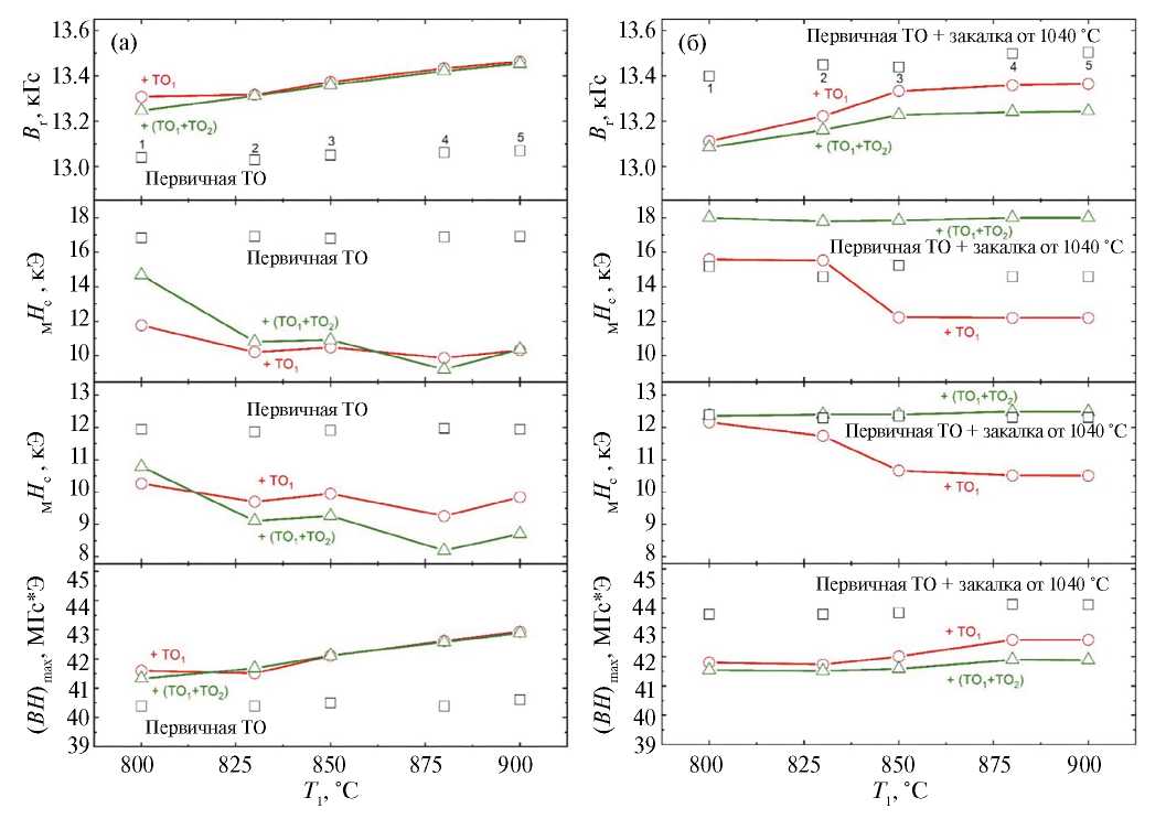 Рис. 2. Параметры кривых размагничивания магнитов после термообработок: (а) после первичной ТО: ТО1 при Т1 = 800–900°С → ТО2 при Т2 = 480°С; (б) после первичной ТО и последующей закалки от 1040°С: ТО1 при Т1 = 800–900°С → ТО2 при Т2 = 480°С. Квадратными символами обозначены магнитные параметры заготовок для последующих ТО: после первичной ТО (а) и после закалки от 1040°С (б).