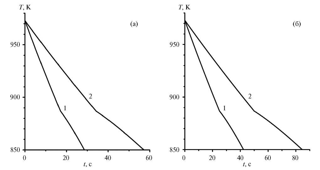 Рис. 5. Изменение температуры расплава при CTiH2 = 1.5 мас. % (а) и CTiH2 = 0.5 мас. % (б): (1) a= 400 Вт/(м·К), (2) a=200 Вт/(м·К).