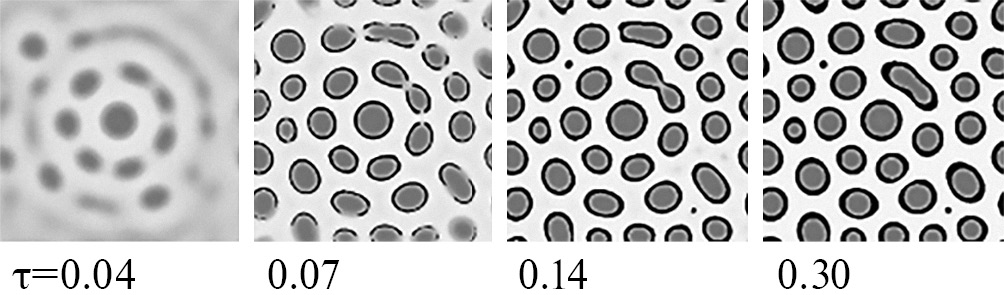 В работе [41] были детально рассмотрены условия кинетической стабилизации выделений в процессе спинодального распада в тройном сплаве. На рис. 2 представлена ситуация, когда распад приводит к формированию структуры “ядро–оболочка” (время приведено в безразмерных единицах τ = tDA (M)/L2, где t — время, DА(M) — коэффициент диффузии атомов сорта A в матрице, L — размер области моделирования). В этом случае атомы сортов A и B оба имеют термодинамический стимул к распаду, как в матрице, так и по отношению друг к другу (все энергии vab < 0). При этом компонент B имеет достаточную подвижность в объеме выделений A, но малоподвижен в матрице. Ниже критической температуры, когда реализуется перекрытие спинодальных областей (рис. 1), распад стартует по компоненту A, а компонент B вытесняется из выделений в матрицу.