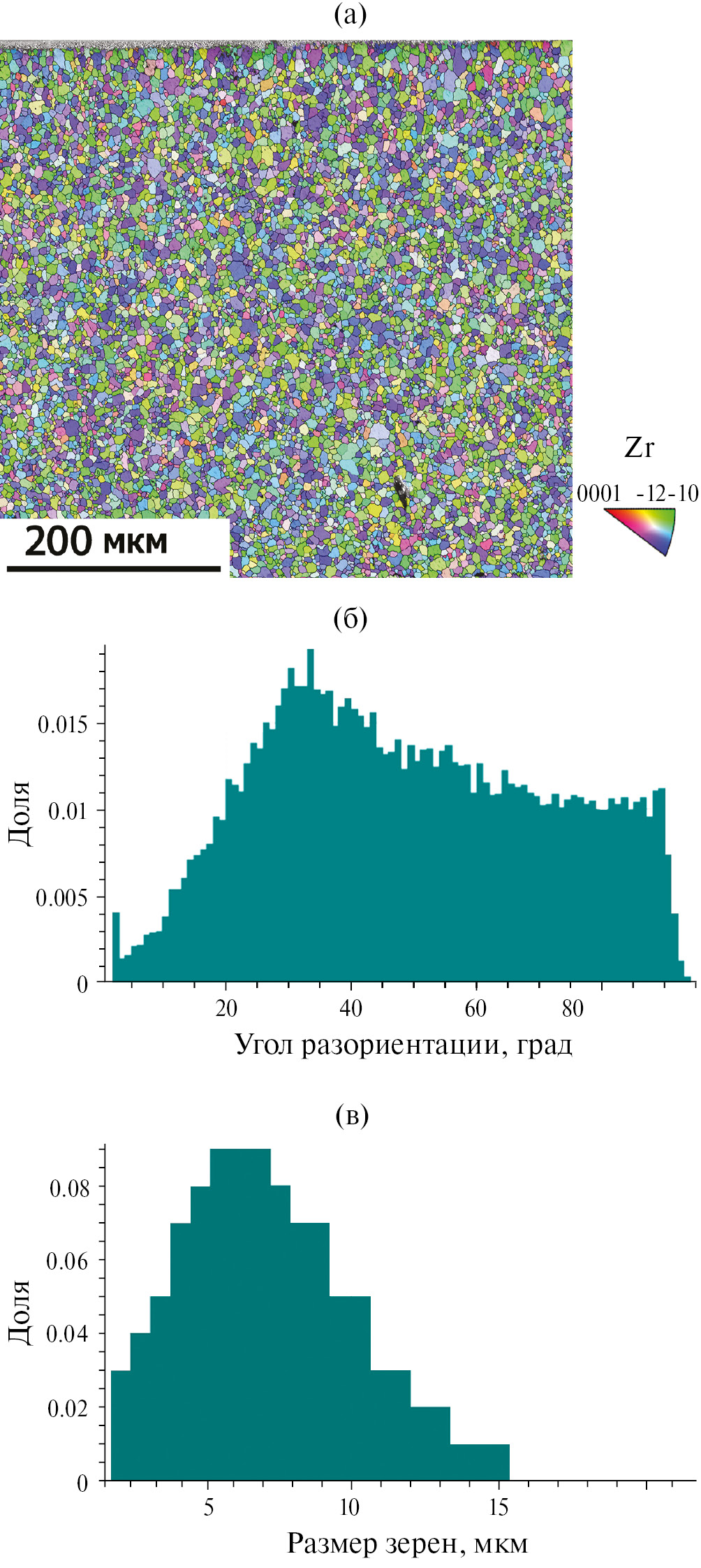 Рис. 1. Результаты EBSD-анализа структуры исходного образца: а — ориентационная карта; б — гистограмма распределения взаимных разориентаций зерен и субзерен; в — распределение зерен по размеру [31].