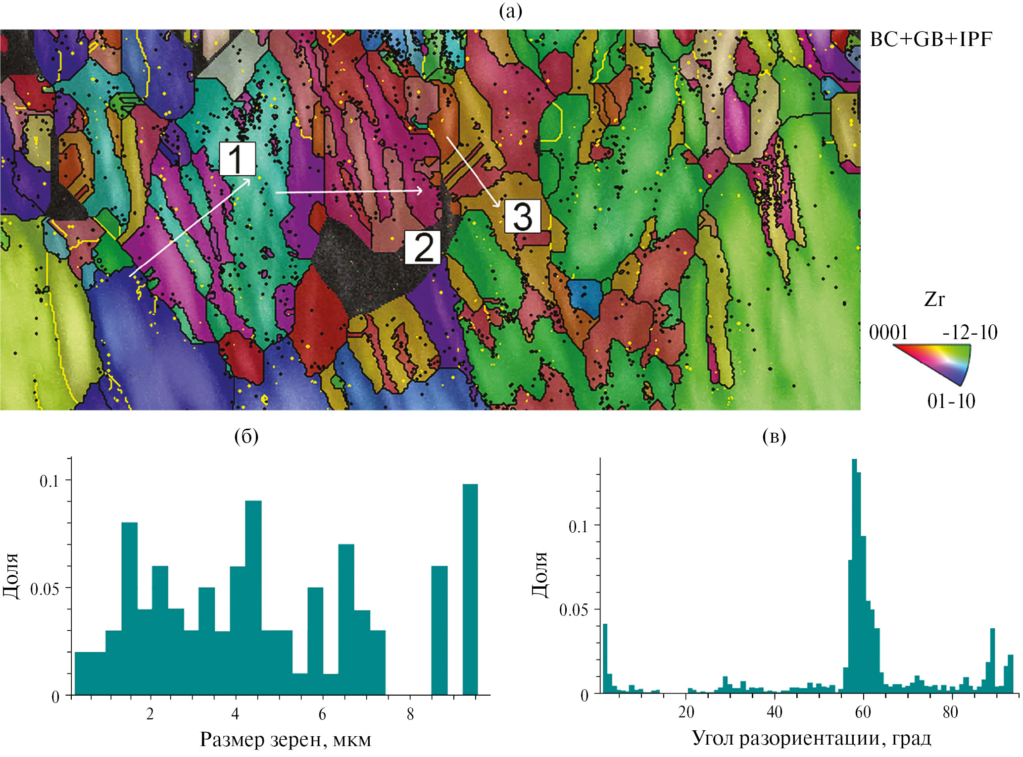 Таким образом, на основании EBSD-анализа можно оценить структуру поверхностного слоя на мезоуровне следующим образом. Внутри крупных кристаллитов (зерен) расположены колонии, состоящие из пластин, по морфологии напоминающие двойники, разделенных прямыми или зубчатыми большеугловыми границами α(αʹ)/α(αʹ) с углами разориентации, близкими к 60°. Согласно [24], такие пластины можно отнести к двойникам типа {101}, которые являются двойниками “сжатия” в направлении оси c. Двойники подобного типа были обнаружены в сплаве Zr–2%Nb, закаленном из двухфазной высокотемпературной области (α+β) [25]. Учитывая, что при лазерном облучении реализуются высокие скорости охлаждения сплава из β-области, можно предположить, что полиморфное превращение и переход β→αʹ осуществляется по механизму сдвиговой перестройки из ОЦК-решетки в ГПУ-решетку с образованием мартенсита. [2, 25].