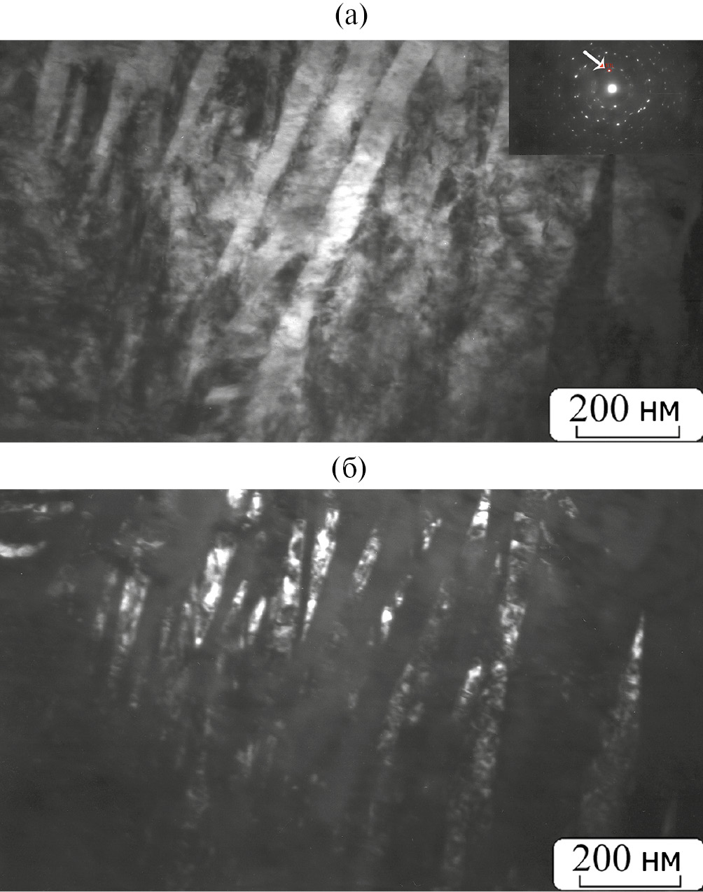 ПЭМ-исследования подтвердили предложенную последовательность структурных превращений. На рис. 5а приведена наиболее типичная структура пластин-двойников, образующих микропакеты из отдельных ламелей αʹ-Zr шириной ~50–100 нм. Из анализа темнопольных изображений (рис. 5б) следует, что каждая ламель мартенсита имеет внутреннюю, различную по контрасту субструктуру, отражающую микроискажение его кристаллической решетки.