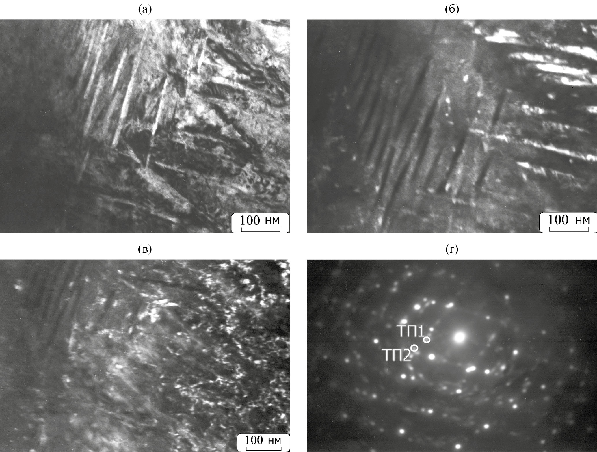 На рис. 6а показана тонкая структура другого участка фольги, а рис. 6б, в иллюстрируют темнопольные изображения, снятые в рефлексах ТП1, ТП2, указанных на микроэлектронограмме (рис. 6г). На темнопольном изображении, полученном в рефлексе ТП1, что соответствует отражению от плоскости (002) αʹ-Zr, показана граница двух микропакетов αʹ-Zr-мартенсита (рис. 6б). На темнопольном изображении, полученным в рефлексе ТП2 (d201=0.174 нм ω-фазы), структурные элементы имеют другую морфологию и разрешаются в виде отдельных частиц неправильной формы, размер которых не превышает 20 нм. Большинство частиц ω-фазы формируются вдоль границ ламелей αʹ-мартенсита. Реализация превращения α → ω дополнительно измельчает структуру поверхностного слоя. Можно отметить, что при воздействии сферических и плоских ударных волн субмикросекундной длительности (давление 7 и более ГПа) в цирконии ω-фаза имеет вид пластин [2, 11]. При воздействии лазерных импульсов наносекундой длительности, как в нашем эксперименте, морфология этой фазы меняется.