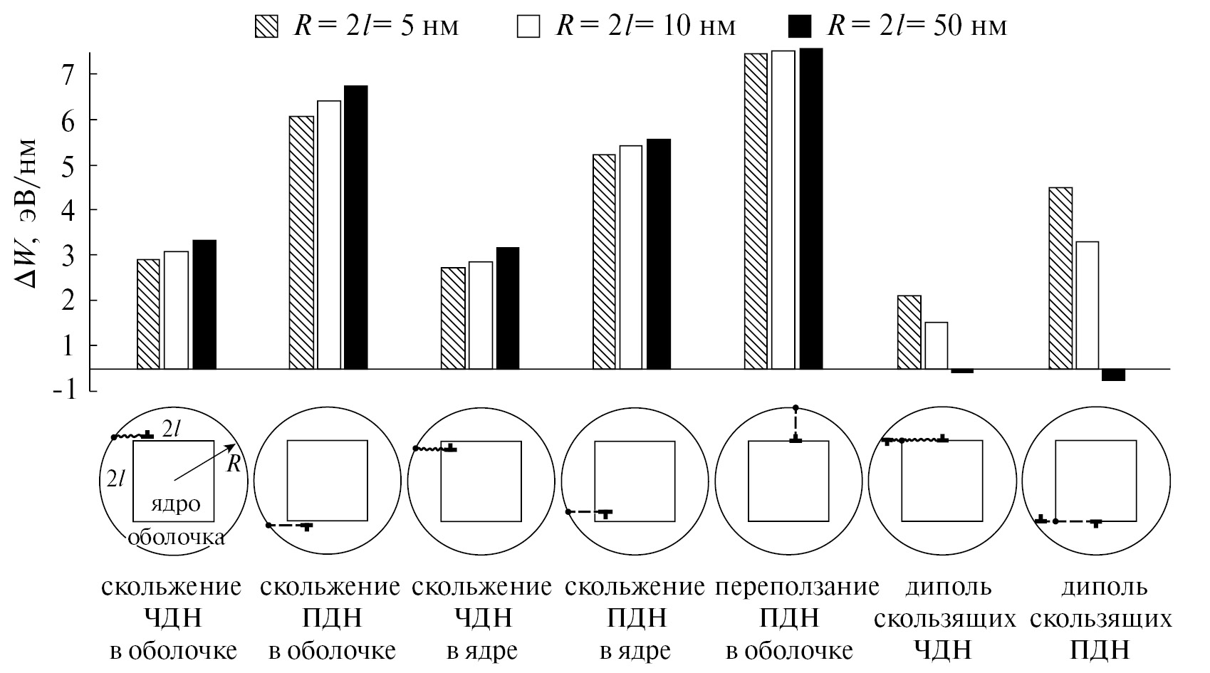 Рис. 5. Энергетические барьеры ΔW для разных механизмов зарождения дислокаций в модельной нанопроволоке Au–Pd радиусом 5, 10 и 50 нм (по данным работы [61]). Под гистограммой приведены схемы действия этих механизмов (слева направо): скольжение частичной дислокации несоответствия (ЧДН) с поверхности нанопроволоки вдоль границы раздела внутри оболочки, скольжение полной дислокации несоответствия (ПДН) с поверхности нанопроволоки вдоль границы раздела внутри оболочки, скольжение ЧДН с поверхности нанопроволоки вдоль границы раздела внутри ядра, скольжение ПДН с поверхности нанопроволоки вдоль границы раздела внутри ядра, переползание ПДН с поверхности нанопроволоки к границе раздела, испускание ребром ядра диполя скользящих ЧДН, испускание ребром ядра диполя скользящих ПДН. Здесь R — радиус нанопроволоки, 2l — сторона квадратного сечения ядра.