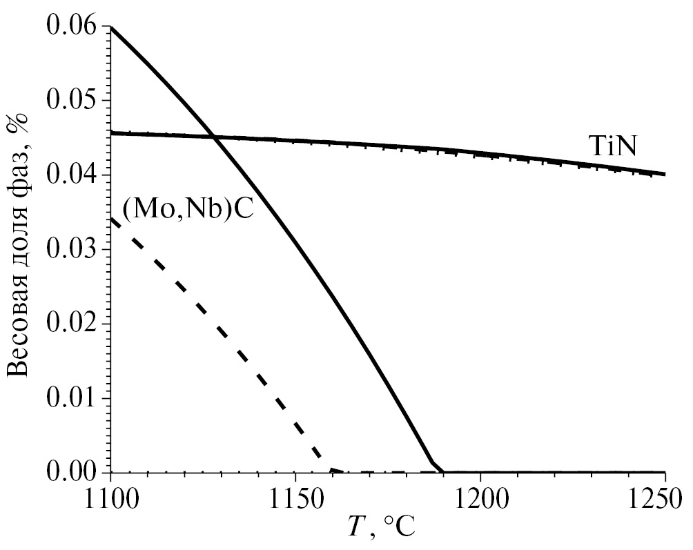 TiN присутствует в стали вплоть до 1250°C, в то время как (Mo, Nb)C полностью растворяется в интервале 1100–1200°С в зависимости от состава стали.