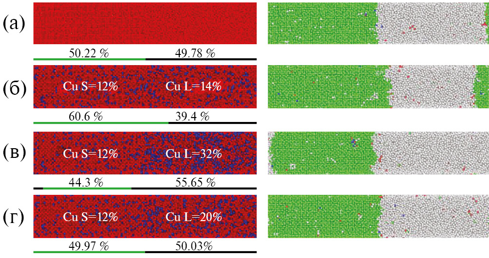 Для определения кривых солидуса и ликвидуса для интересующих нас бинарных систем воспользуемся методом CMI (Compositional Moving Interface), предложенным в работах [27, 28]. Суть данного метода заключается в возможности определения равновесных концентраций компонент сплава в жидкости и в кристаллической фазе при определенной температуре по отсутствию движения межфазной границы кристалл/жидкость. Рассмотрим алгоритм расчета кривых солидуса и ликвидуса на примере бинарного сплава Cu–Ni. В настоящей работе для расчета использовали относительно небольшие системы размером 12 × 12 × 60 элементарных ячеек, содержащих 34 560 атомов. Контроль давления и температуры осуществляли при помощи термостата и баростата Нозье–Гувера [29, 30]. В начальный момент времени создается двухфазная система, которая состоит полностью из более тугоплавкого компонента (чистого никеля в данном случае) и в твердой, и в жидкой фазах (риc. 1a). Далее в системе случайным образом осуществляли замену атомов никеля на атомы меди с различными концентрациями меди в жидкости и в кристалле. Такие системы с добавленными атомами меди термализовались при интересующей нас температуре, и далее на протяжении 0.5 нс в них контролировали смещение границы кристалл/жидкость. Значения равновесных концентраций меди в жидкости и в кристалле определяли по отсутствию смещения границы на протяжении всего времени моделирования. Отсутствие движения гарантирует, что концентрация меди в кристалле и жидкости не изменяется в результате плавления или роста кристалла. На рис. 1 представлены три возможных варианта поведения межфазной границы кристалл/жидкость в результате моделирования, соответствующие различным перераспределениям атомов меди между жидкостью и кристаллом: б – рост кристалла (недостаток меди в расплаве), в – плавление кристалла (избыток меди в расплаве), г – граница неподвижна, концентрации меди и никеля в кристалле и расплаве находятся в равновесном состоянии. Моделируя с шагом в 0.25 – 2 % по концентрациям, мы можем определить такие концентрации, когда смещение межфазной границы не происходит, что и будет соответствовать концентрациям на линиях солидуса и ликвидуса при интересующей нас фиксированной температуре.