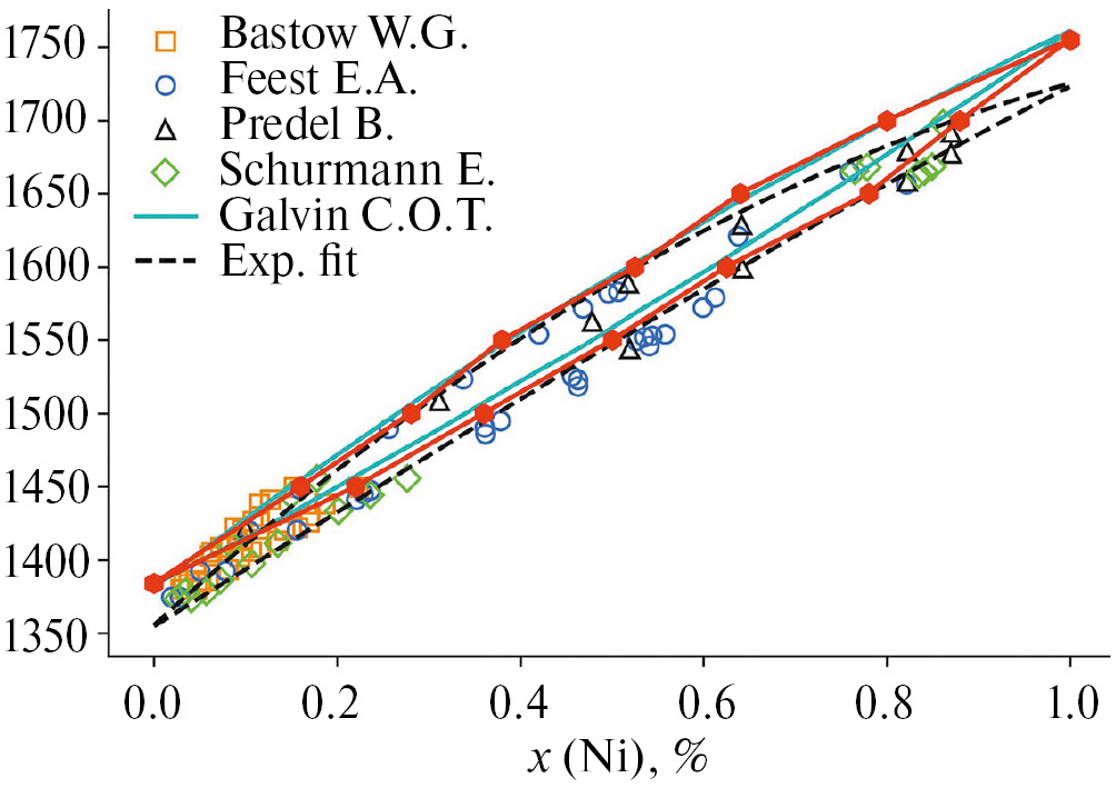 С использованием CMI-метода были определены фазовые диаграммы рассматриваемых бинарных систем. На рис. 2 приведена фазовая диаграмма бинарного сплава Cu–Ni, рассчитанная CMI-методом, и известные экспериментальные данные по положению линий солидуса и ликвидуса [31–34]. Полученные результаты с высокой точностью воспроизводят результаты экспериментов. Данная методика позволяет с приемлемой точностью рассчитывать фазовые диаграммы бинарных сплавов даже с относительно небольшой разницей температур солидуса и ликвидуса.