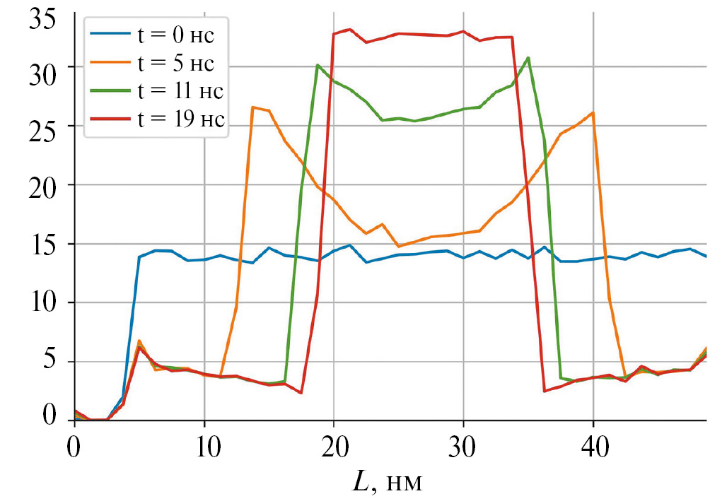 Рис. 4. Профили концентрации никеля в системе вдоль наиболее длинного направления перпендикулярно границе раздела кристалл–жидкость на моменты времени, представленные на рис. 3.