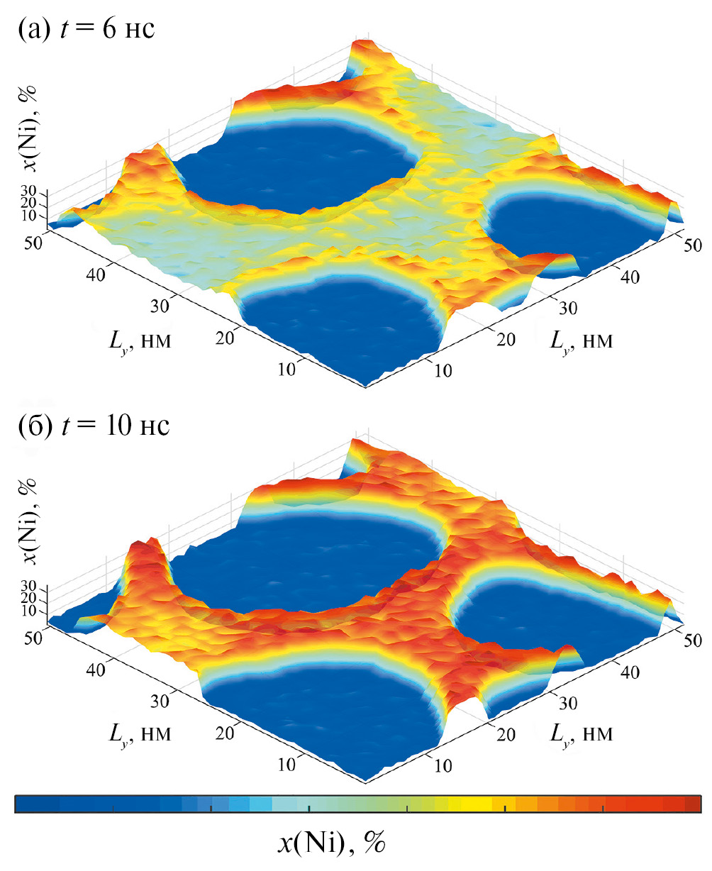 На рис. 6 видно, как происходит перераспределение никеля, а также замедление роста кристаллитов. Если в первые 2 нс расчета кристаллиты быстро увеличиваются в размерах, то с 6-й по 10-ю наносекунду их размеры практически не меняются. На рис. 6 также видны локальные области повышенной концентрации Ni, непосредственно прилегающие к поверхностям раздела расплава и кристаллитов (рис. 7а). Эти области повышенной концентрации образованы “лишним” никелем, который не растворился в растущих ОЦК-зернах и не успел из-за медленной по сравнению со скоростью роста зерна диффузии перераспределиться в расплаве. Изначально зерна растут равномерно во все стороны, однако при “встрече” двух растущих зерен повышенные концентрации никеля перед их межфазными границами “не дают” зернам расти навстречу друг другу. При этом рост кристаллитов продолжается в других направлениях, в которых “лишним” атомам Ni есть куда диффундировать. По истечении времени после окончания роста кристаллитов области повышенного содержания никеля перед границами раздела кристалла и жидкости рассасываются за счет диффузии, и концентрация никеля в расплаве выравнивается (рис. 7б), достигая равновесного значения на линии ликвидуса при данной температуре. Таким образом, при скоростях кристаллизации, сравнимых со скоростями перераспределения примесей, возможны флуктуации концентрации примесей вдоль нормали к фронту кристаллизации.