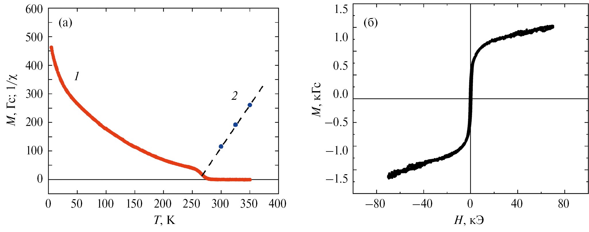 Рис. 2. Магнитные свойства пленки Gd: (а) температурные зависимости намагниченности (кривая 1) и обратной парамагнитной восприимчивости (кривая 2); (б) петля гистерезиса, измеренная при температуре 5 К.