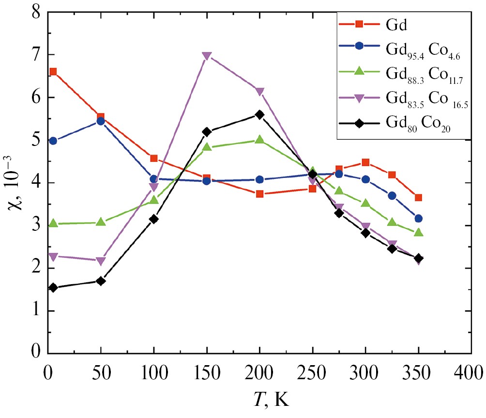 Рис. 4. Температурные зависимости высокополевой восприимчивости пленок Gd100-xCox разного состава.