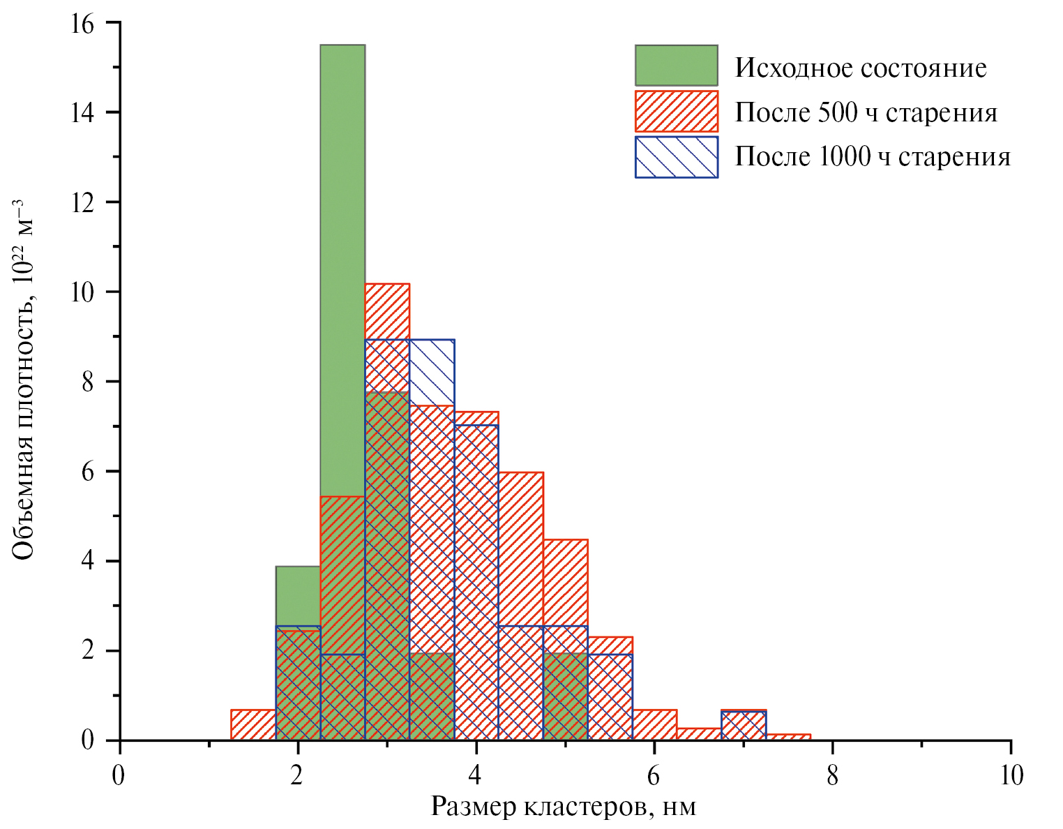 Сравнение полученных данных после термического старения с данными для исходного состояния демонстрирует во всех сталях рост объемной плотности кластеров (при сохранении или росте их среднего размера) при старении в течение 500 ч, соответствующий стадии зарождения кластеров. В то время как после старения в течение 1000 ч обнаружено уменьшение объемной плотности, что соответствует стадии коалесценции. Данные закономерности также подтверждаются анализом изменения концентрации химических элементов в матрице.