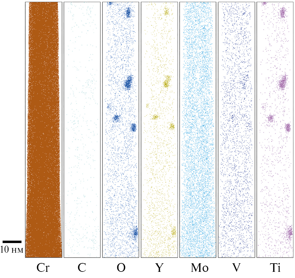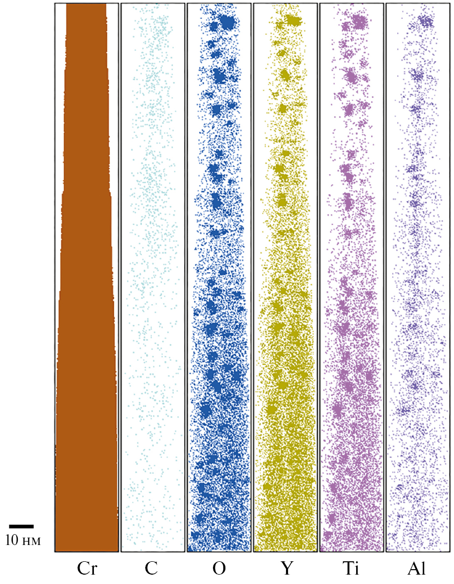 AЗT-анализ исходного состояния ДУО-сталей выявил существенное число нанокластеров, имеющих размер в диапазоне 2–4 нм, обогащенных по Cr, Y, O, а также по Ti, V и Al, в зависимости от системы легирования [30]. В стали Eurofer ODS, не содержащей Ti, в кластерах присутствует значительное количество ванадия. В стали 10Cr ODS, содержащей V и Ti в сравнительно близких концентрациях, кластеры преимущественно обогащены по Ti. В стали KP-3 ODS, содержащей в ~30 раз больше Al по сравнению с Ti, кластеры тем не менее преимущественно обогащены по Ti.