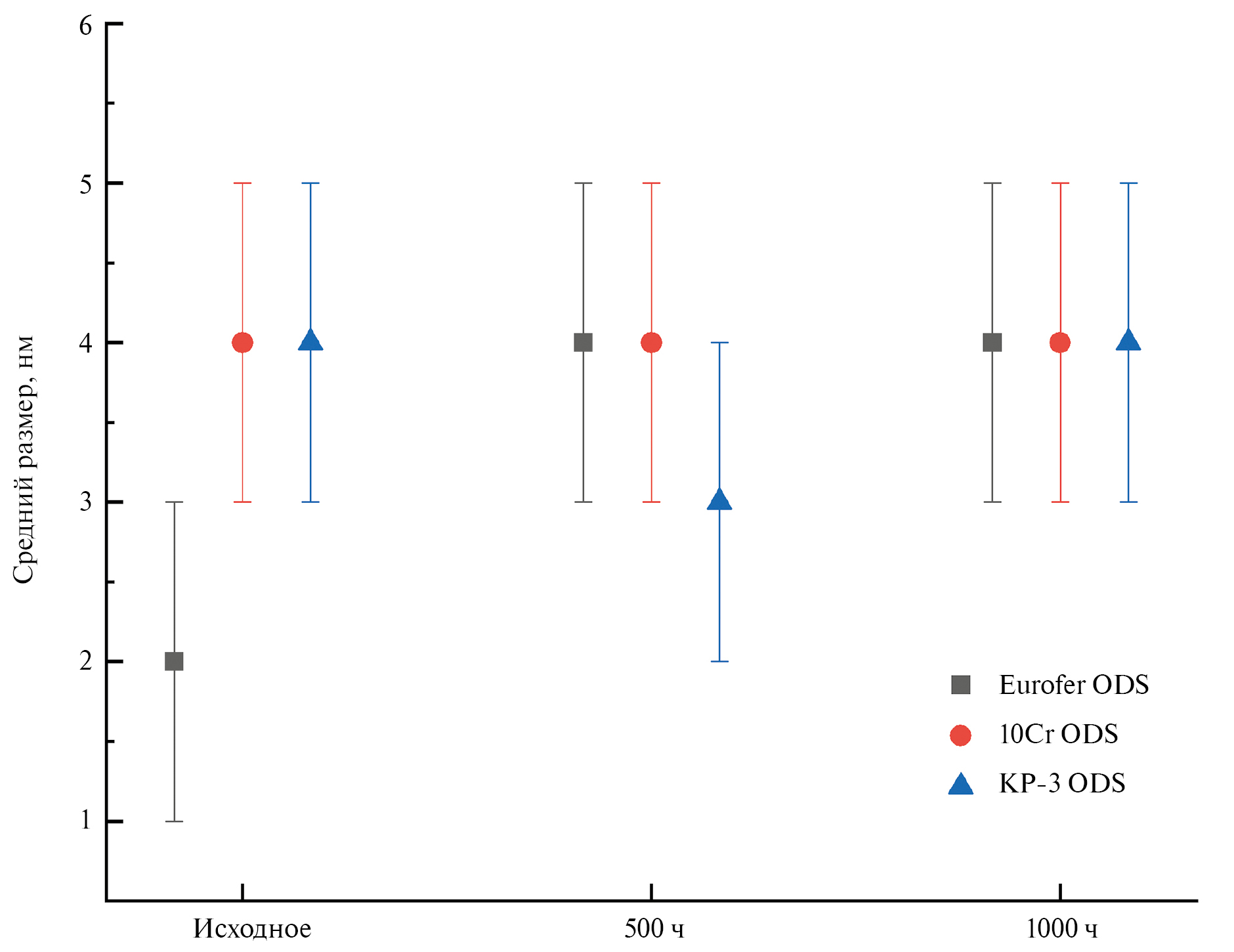 KP-3 ODS | Cr–Y–O–Ti–Al | 4 ± 1 | 4 ± 1 | 3 ± 1 | 45 ± 4 | 60 ± 3 | 62 ± 5 |