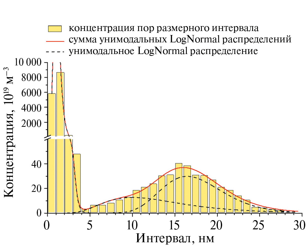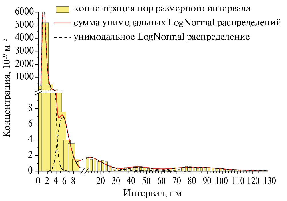 Максимальный размер пор в образцах НТ1 не превышает 30 нм, а в НТ2 – 50 нм. Типичная гистограмма распределения пор по размерам приведена на рис. 4, математически корректно она описывается тремя унимодальными логнормальными распределениями, соответствующими трем типам пор: мелкие, среднего размера и крупные.