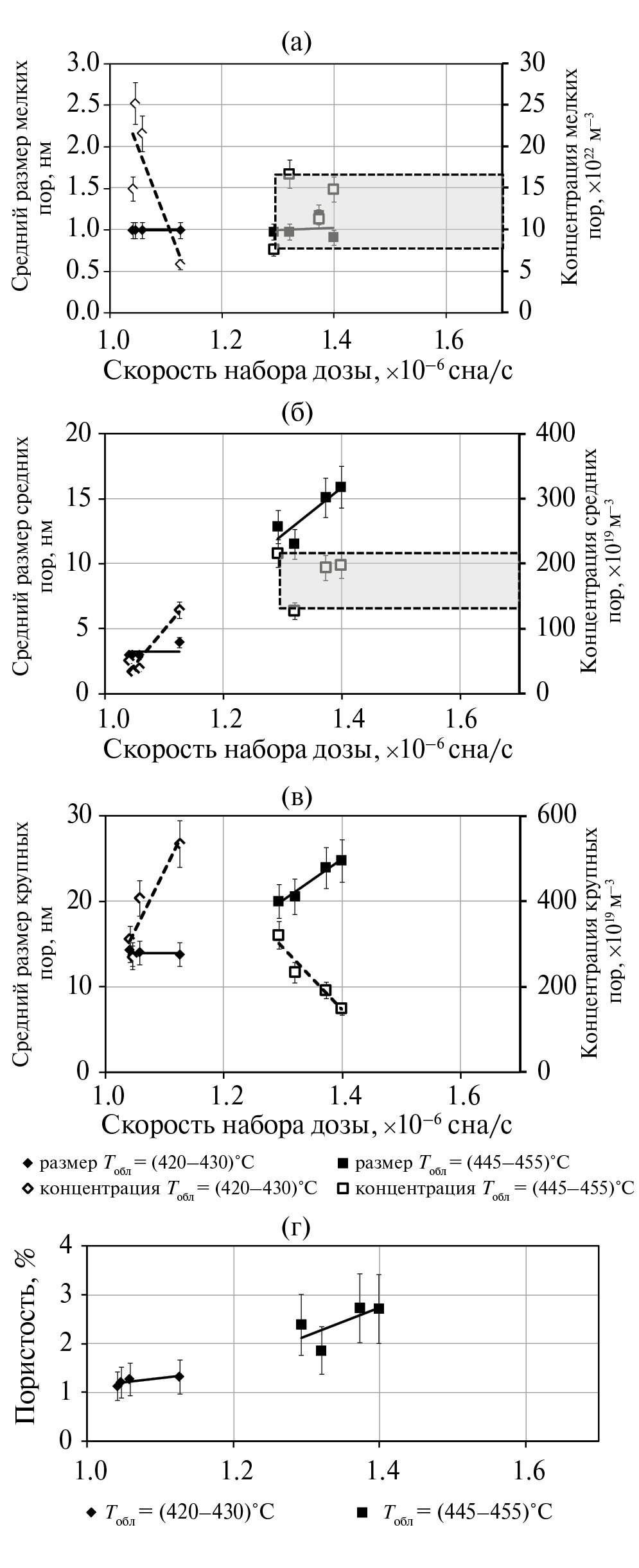 Рис. 8. Характеристики мелких (а), среднего размера (б) и крупных (в) пор в образцах стали типа Cr16–Ni19 из среднетемпературных диапазонов облучения и интегральная пористость образцов (г).