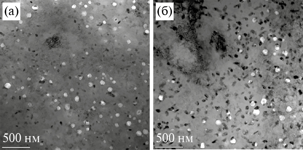 Рис. 9. Микроструктура стали типа Cr16–Ni19, характерная для высокотемпературных диапазонов облучения ВТ1, ВТ2: (а) температурный диапазон (540–550)°С, скорость генерации атомных смещений 1.6 ∙ 10-6 сна/c; (б) температурный диапазон (560–570)°С, скорость генерации атомных смещений 1.5 ∙ 10-6 сна/c.