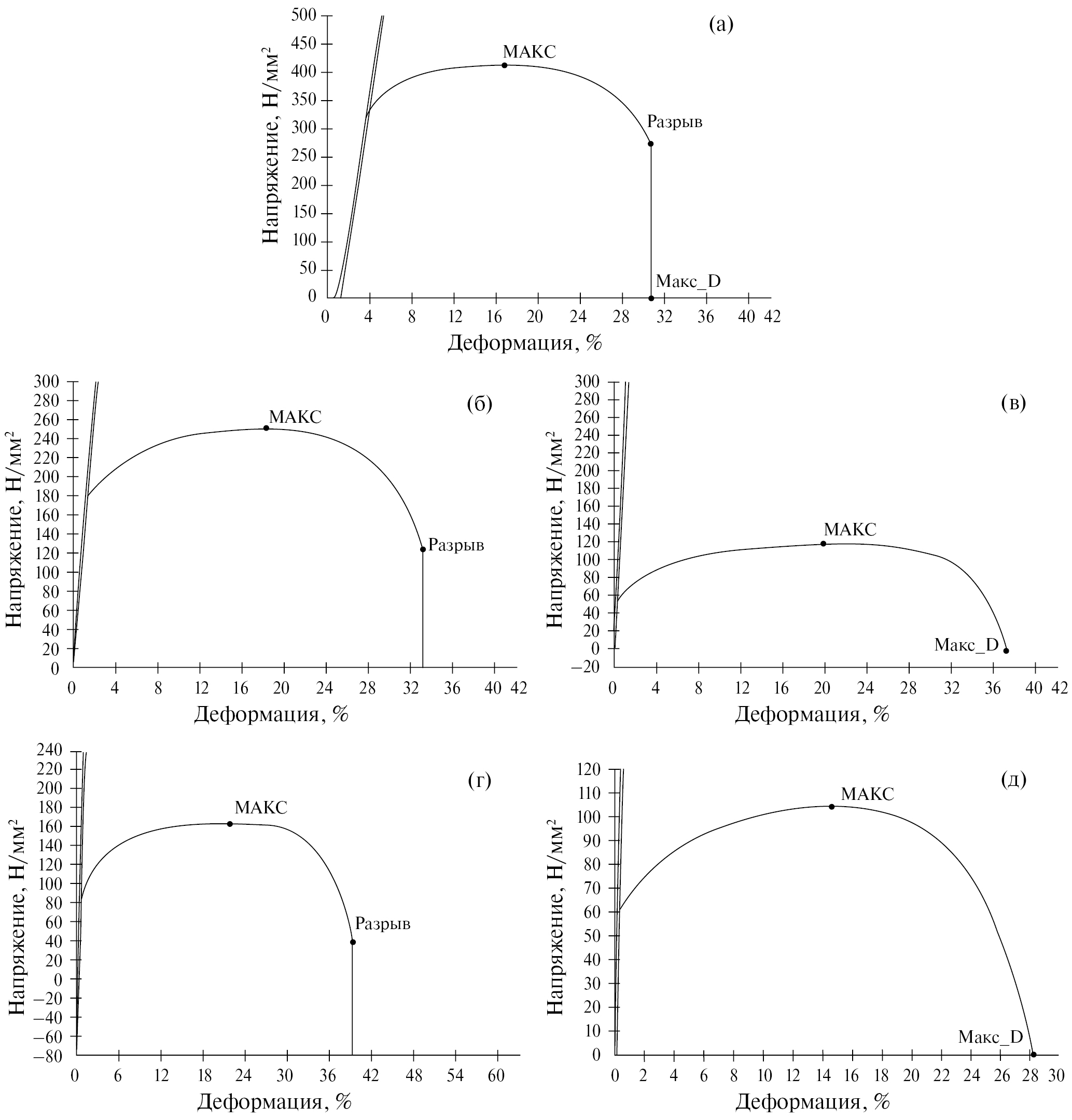 Рис. 1. Диаграммы растяжения образцов титана ВТ1-0: а – отжиг; б, в – отжиг, ААО2; г, д – ААО2 без отжига. Образцы на рис. 1в и д не разорвались.
