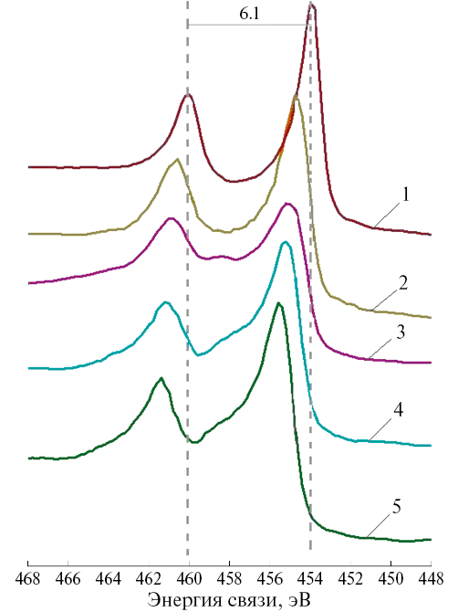 Образование нитридов титана подтверждается анализом Ti2p-спектров (рис. 7). В исходном состоянии максимум линии Ti 2p3/2 на глубине анализа ~20 нм приходится на 454 эВ, а его дуплет Ti 2p1/2 отстоит от него примерно на расстоянии 6.1 эВ (рис. 7, спектр 1). Это свидетельствует о металлическом состоянии атомов титана в исходном образце на данной глубине. В этом состоянии они находятся в узлах кристаллической решетки твердого раствора. После обработки при всех режимах азотирования в большей или меньшей степени наблюдается, во-первых, сдвиг максимумов линий дуплетов Ti 2p3/2 и Ti 2p1/2 в сторону больших энергий и, во-вторых, уменьшение расстояния между ними (рис. 7, спектры 2–5). Это свидетельствует об изменении степени окисления атомов титана и является следствием образования указанных выше соединений оксидов, нитридов, оксинитридов и гидрооксидов титана.