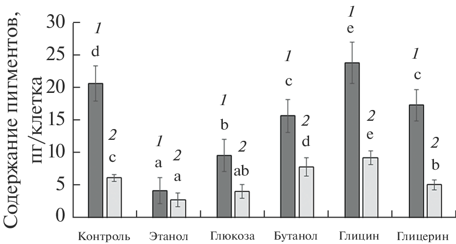 Проведено исследование общего биохимического состава и профиля низкомолекулярных метаболитов клеток эвглены (Euglena gracilis Klebs.), растущих в миксотрофной культуре с добавлением 0.5% этанола, глюкозы, бутанола, глицина или глицерина. Этанол и глюкоза существенно стимулировали рост культуры эвглены и накопление в клетках запасных соединений (парамилона и восковых эфиров). Бутанол также способствовал делению клеток эвглены и усилению биосинтеза белка, моно- и дисахаридов, каротиноидов и токоферолов. Глицин и глицерин усваивались медленнее, чем другие субстраты, и накапливались в клетках E. gracilis вместе со своими непосредственными производными. Глицин не стимулировал рост культуры, но вызывал накопление в клетках парамилона, органических кислот цикла Кребса и азотсодержащих метаболитов (хлорофилла, свободных аминокислот и азотистых оснований). По-видимому, в условиях миксотрофии глицин одинаково эффективно используется эвгленой как дополнительный источник и углерода, и азота. Усвоение глицерина сопровождалось накоплением в клетках эвглены восковых эфиров, а также аминокислот пролина и орнитина. В целом, полученные результаты демонстрируют способность эвглены существенно перестраивать свой метаболизм при усвоении органических субстратов различной химической природы. Данные могут быть использованы в контексте прикладного применения E. gracilis.