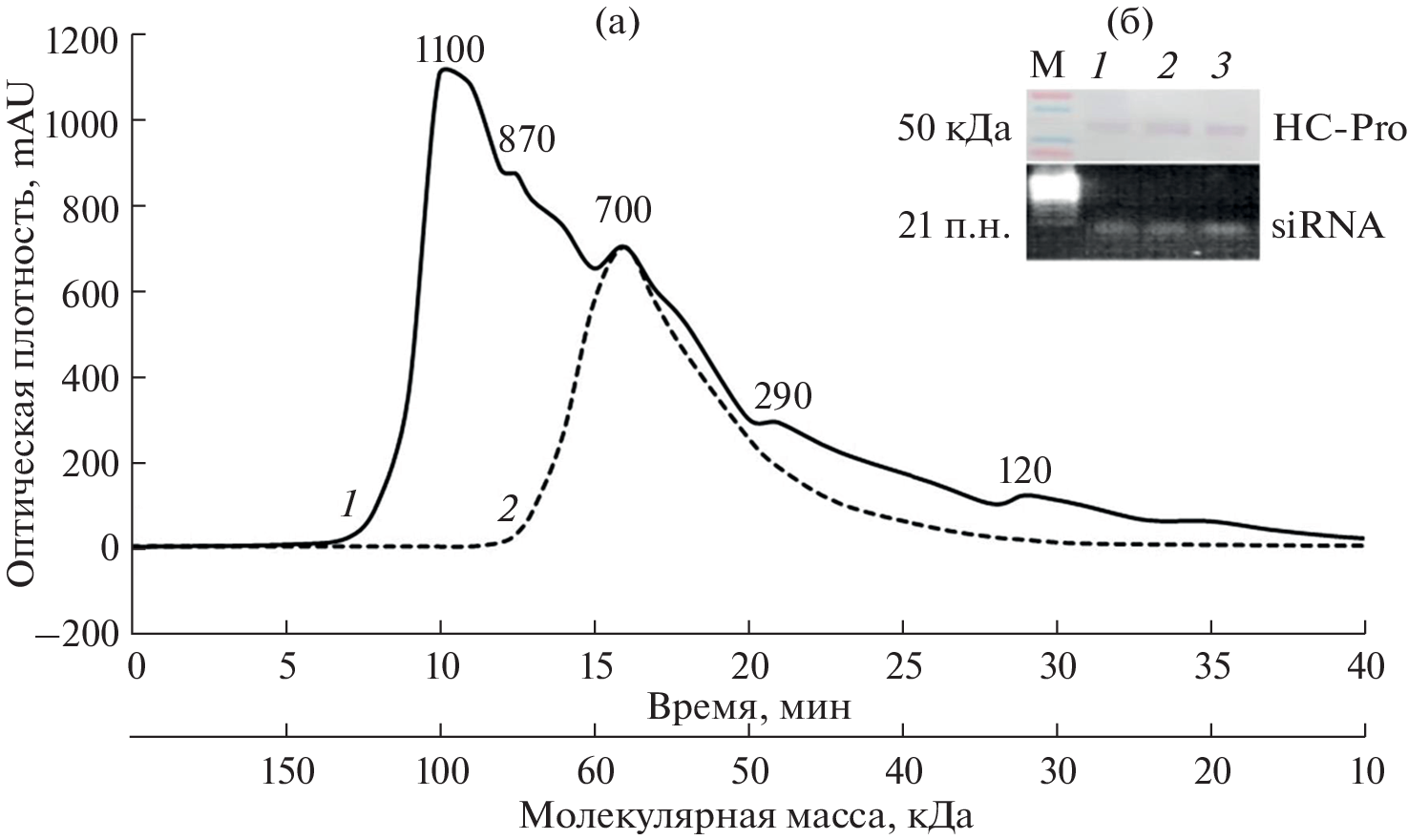 Tools for activating crop resistance to viruses are now becoming part of a comprehensive plant protection strategy. Artificial resistance to viruses through expression of the viral envelope protein in transgenic plants is fairly well understood. An urgent issue is the study of small RNAs involved in the protective mechanisms of RNA interference against viruses. Understanding the role of short interfering RNA (siRNA) in the regulation and shutdown of genes is important. The proteinase accessory component (HC-Pro), a multifunctional suppressor protein synthesized by the potato virus Y, is able to neutralize S. tuberosum plant defenses by trapping siRNA and removing them from the RNA interference process, thereby causing systemic infection of the host plant. Protein liquid chromatography combined with high performance sequencing can help recognize the large number of small RNAs resulting from viral RNA degradation and identify 21–23 bp. siRNA from PVY-infected S. tuberosum plants. The HC-Pro/siRNA nucleoprotein complex was detected in chromatographic fractions using antibodies against HC-Pro, Southern-blot indicated the presence of small RNAs in the complex, and analysis of data from deep sequencing of the small RNA population determined a specificity of 21–23 bp. siRNA to the envelope protein of the PVY virus. The research results can be applied in the study of intracellular signaling molecules and stimulate new research on antiviral mechanisms to develop effective strategies for plant protection against viruses.