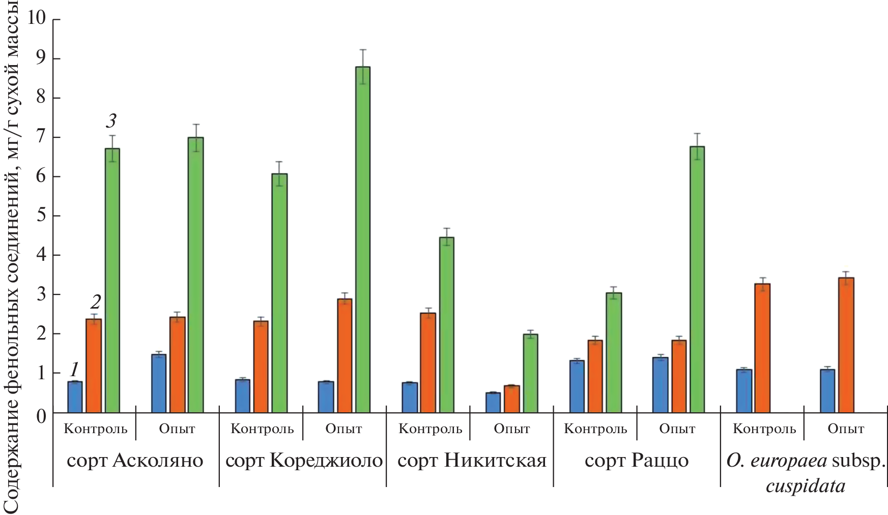 - Ortega-Garcıa F., Peragon J. Phenol metabolism in the leaves of the olive tree (Olea europaea L.) cv. Picual, Verdial, Arbequina, and Frantoio during Ripening // J. Agric. Food Chem. 2010. V. 58. P. 12440. https://doi.org/10.1021/jf102827m