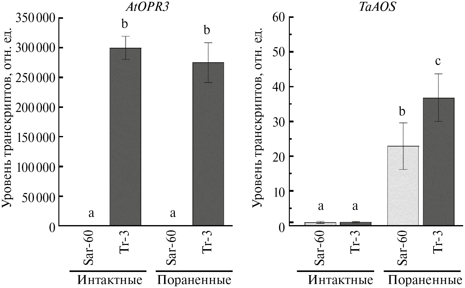 Рис. 1. Анализ экспрессии генов пути биосинтеза жасмонатов в трансгенных (Tr-3) и контрольных растениях (Sar-60) пшеницы. Данные представляют собой средние значения ± стандартные ошибки (n = 4). Буквы обозначают статистически значимые различия при P < 0.05 (ANOVA с последующим тестом Дункана).