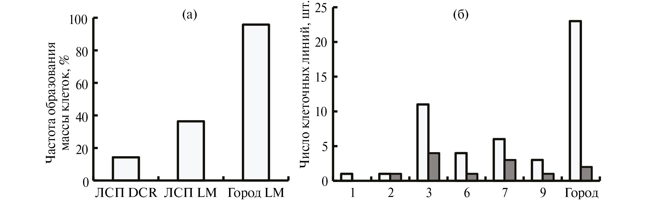 Рис. 2. Частота образования массы клеток (а) из зародышей Picea abies, собранных с деревьев на Петрозаводской лесосеменной плантации (ЛСП) и в г. Петрозаводске; б – число клеточных линий. Светлые столбцы – клеточные линии, сформированные в летний сезон 2022 г.; темные столбцы – клеточные линии, сохранившихся спустя 14 месяцев культивирования.