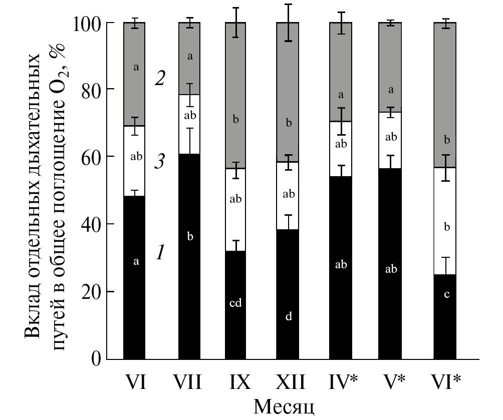 Примечание: Vt – общее дыхание, Vcyt – цитохромное дыхание, Valt – альтернативное дыхание, Vres – немитохондриальное остаточное дыхание. Символом “*” отмечены данные для перезимовавших листьев. Представлены средние арифметические значения и их стандартные ошибки. Разными латинскими буквами обозначены статистически значимые различия исследуемого показателя в течение года (ANOVA, критерий Дункана, n = 5 – 10, Р ≤ 0.05).