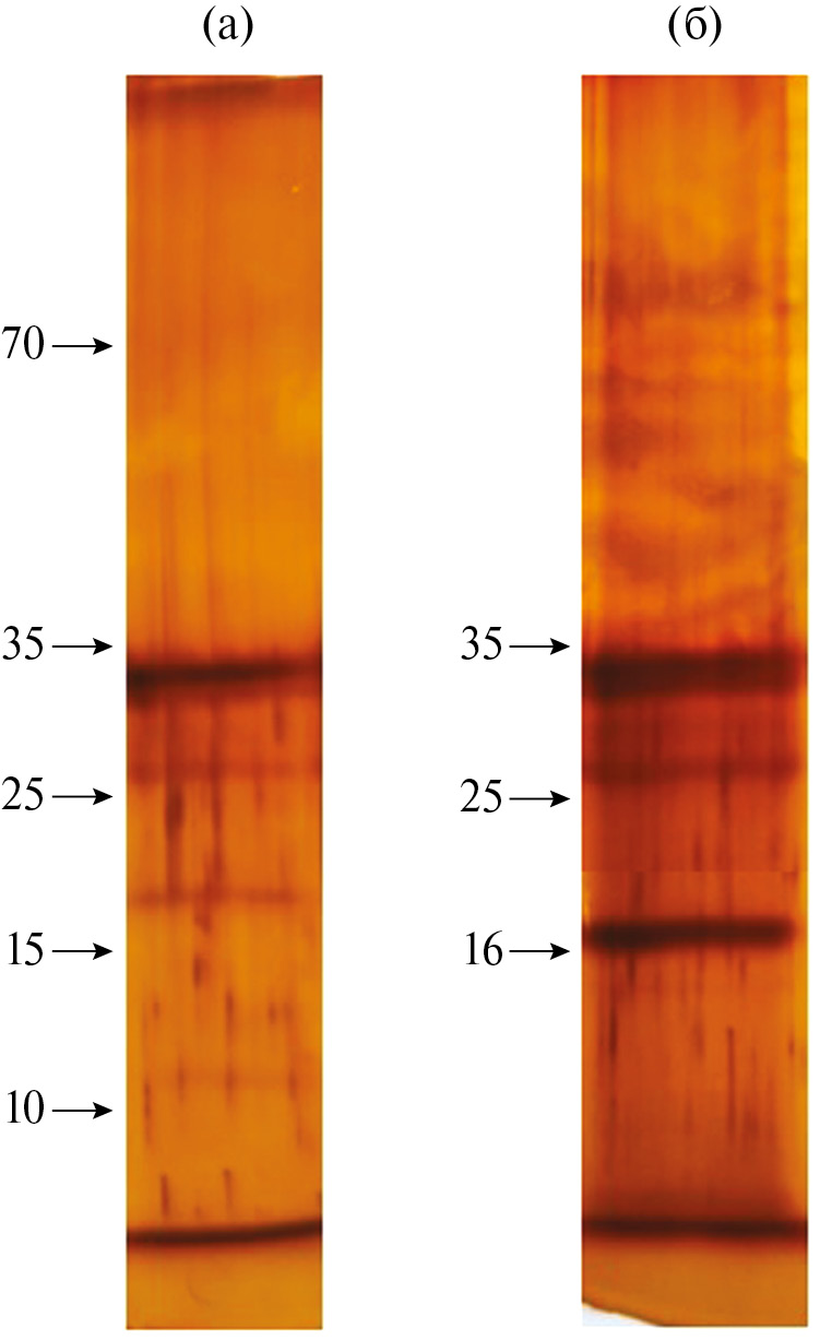 В результате ряда этапов очистки, включающей фракционирование сульфатом аммония, диализ и гель-фильтрацию (рис. 2а, б), в электрофоретически гомогенном виде была получена МКП, Rf которой составляла 0.03 (рис. 2в). Полоса активности этой пероксидазы присутствовала во всех образцах, и положение ее оставалось неизменным. Молекулярная масса МКП по данным гель-фильтрации составляла 155 кДа. На субъединичную структуру этой пероксидазы указывали данные денатурирующего гель-электрофореза с ДДС. Минимум три субъединицы входили в состав МКП, их молекулярная масса составляла 35, 25 и 16 кДа (рис. 3а, б).