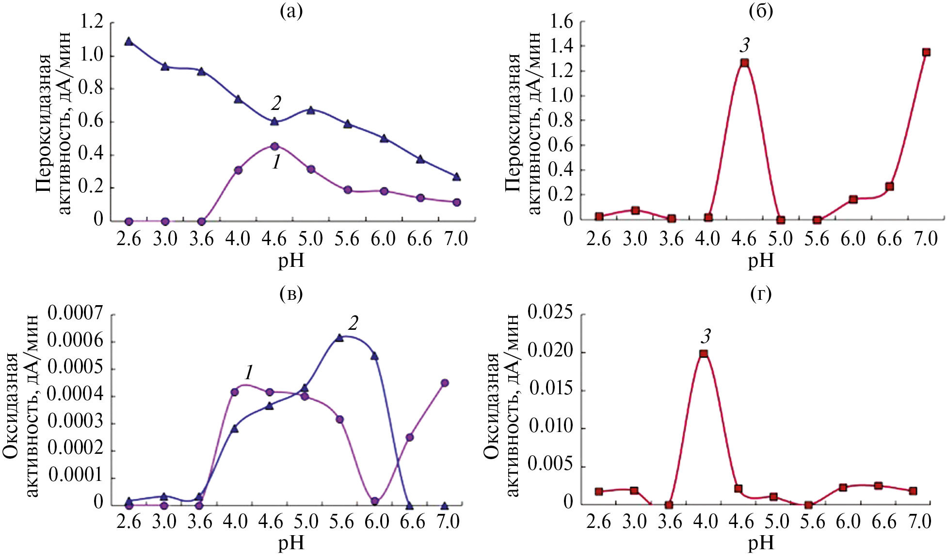 МКП проверяли на способность окислять ряд субстратов как в присутствии перекиси водорода, так и без нее в диапазоне рН от 2.6 до 7.0. Максимальные показатели пероксидазной активности получили при следующих значениях рН: для ДМФ – 4.6, АБТС – 2.6, АСК – 7.0 (рис. 4а, б), а оксидазной активности – при рН: для ДМФ – 7.0, АБТС – 5.6, АСК – 4.0 (рис. 4в, г). Максимальная удельная пероксидазная активность наблюдалась по отношению к АСК – 6.5 × 10–7 моль/мин/мг белка. Для ДМФ и АБТС показатели близки – 4.2 × 10–8 и 5.0 ×.10–8 моль/мин/мг белка. Удельная оксидазная активность увеличивалась в ряду АБТС, ДМФ и АСК, достигая при этом 2.8 × 10–11, 4.1 × 10–11 и 9.6 × 10–9 моль/мин/мг белка соответственно. Стоит отметить, что удельная оксидазная активность МКП к ДМФ превышала таковую для АБТС в 1.5 раза.
